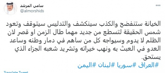 وجه المحلل السياسي السعودي سامي البشير المرشد، اليوم، رسالة نارية للمساهمين في تدمير أوطانهم بالمنطقة العربية، مؤكدًا أن الخيانة ستنفضح والكذب سينكشف والتدليس سيتوقف.