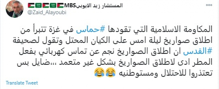 وقال في تغريدة عبر "تويتر" رصدها "المشهد العربي": "المكاومة الإسلامية التي تقودها حماس في غزة تتبرأ من إطلاق صواريخ ليلة أمس على الكيان المحتل وتقول لصحيفة القدس أن إطلاق الصواريخ نجم عن تماس كهربائي بفعل المطر أدى لاطلاق الصواريخ بشكل غير متعمد ،،،ضايل بس تعتذروا للاحتلال ومستوطنيه".