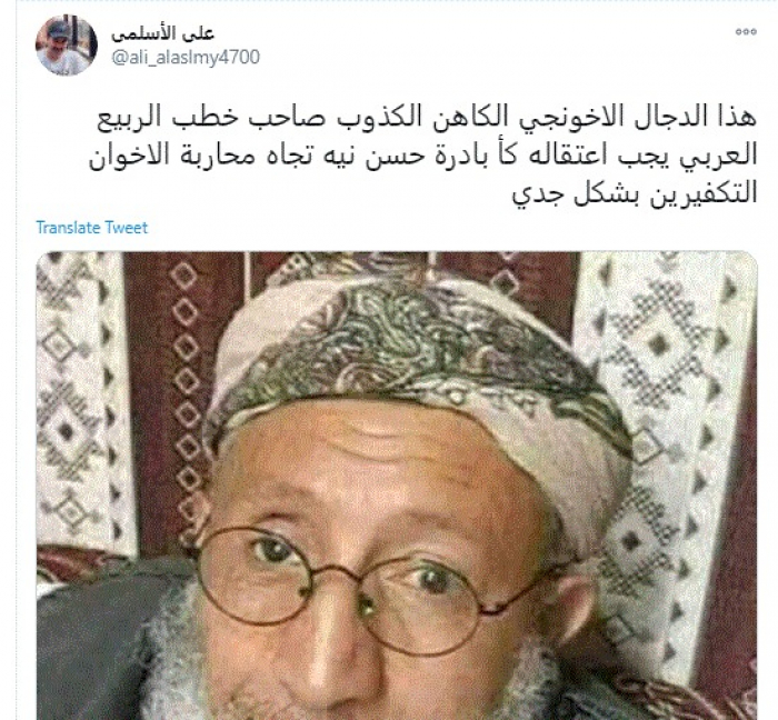 وقال في تغريدة عبر "تويتر" رصدها "المشهد العربي": "هذا الدجال الإخونجي الكاهن الكذوب صاحب خطب الربيع العربي يجب اعتقاله كبادرة حسن نية تجاه محاربة الإخوان التكفيرين بشكل جدي".