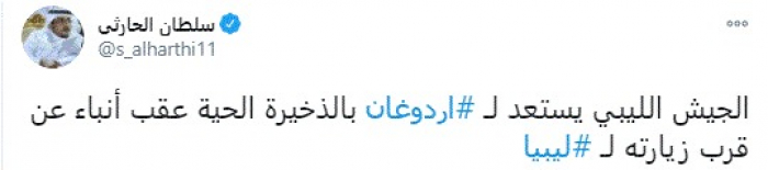 وقال في تغريدة عبر "تويتر" رصدها "المشهد العربي": "الجيش الليبي يستعد لأردوغان بالذخيرة الحية عقب أنباء عن قرب زيارته لليبيا".