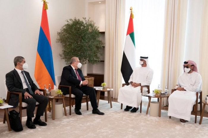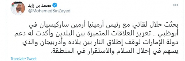 وقال في تغريدة عبر "تويتر" رصدها "المشهد العربي": "بحثت خلال لقائي مع رئيس أرمينيا أرمين ساركيسيان في أبوظبي .. تعزيز العلاقات المتميزة بين البلدين وأكدت له دعم دولة الإمارات لوقف إطلاق النار بين بلاده وأذربيجان والذي يسهم في إحلال السلام والاستقرار في المنطقة".