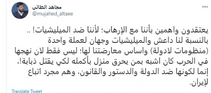 وكتب في تغريدة عبر "تويتر" رصدها "المشهد العربي": "يعتقدون واهمين بأننا مع الإرهاب؛ لأننا ضد الميليشيات! .. بالنسبة لنا داعش والميليشيات وجهان لعملة واحدة (منظومات لا دولة) وأساس معارضتنا لها؛ ليس فقط لأن نهجها في الحرب كان أشبه بمن يحرق منزل بأكمله لكي يقتل ذبابة!".