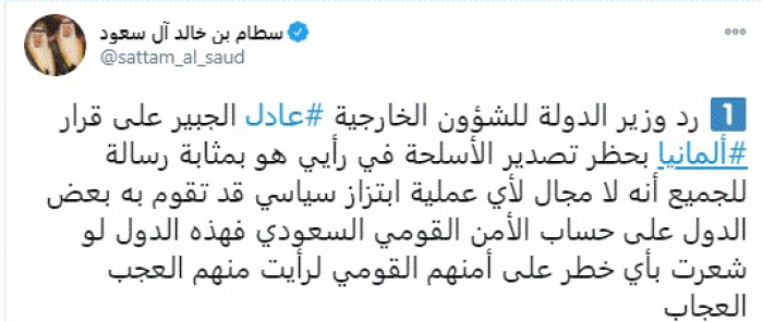 وقال في تغريدة عبر "تويتر" رصدها "المشهد العربي": "رد وزير الدولة للشؤون الخارجية عادل الجبير على قرار ألمانيا بحظر تصدير الأسلحة في رأيي هو بمثابة رسالة للجميع أنه لا مجال لأي عملية ابتزاز سياسي قد تقوم به بعض الدول على حساب الأمن القومي السعودي فهذه الدول لو شعرت بأي خطر على أمنهم القومي لرأيت منهم العجب العجاب".