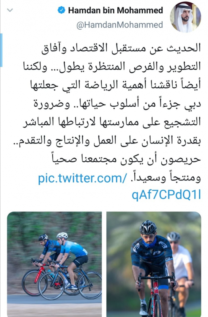 وقال آل نهيان في تغريدة له عبر حسابه بتويتر ورصدها "المشهد العربي" : "الحديث عن مستقبل الاقتصاد وآفاق التطوير والفرص المنتظرة يطول... ولكننا أيضاً ناقشنا أهمية الرياضة التي جعلتها دبي جزءاً من أسلوب حياتها.. وضرورة التشجيع على ممارستها لارتباطها المباشر بقدرة الإنسان على العمل والإنتاج والتقدم.. حريصون أن يكون مجتمعنا صحياً ومنتجاً وسعيداً".