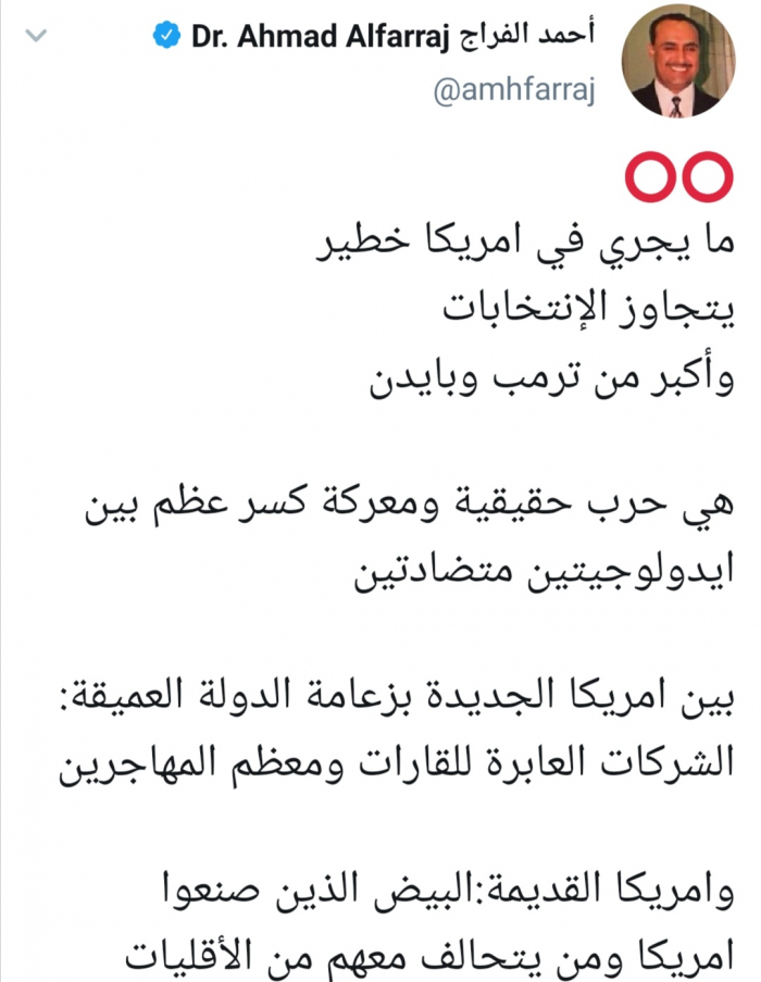 وقال الفراج عبر تغريدة له على حسابه بتويتر ورصدها "المشهد العربي" : "ما يجري في أمريكا خطير يتجاوز الانتخابات وأكبر من ترمب وبايدن".