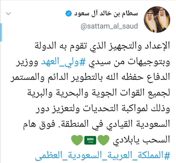 وقال آل سعود في تغريدة له عبر حسابه بتويتر ورصدها "المشهد العربي": "الإعداد والتجهيز الذي تقوم به الدولة وبتوجيهات من سيدي ولي العهد ووزير الدفاع حفظه الله بالتطوير الدائم والمستمر لجميع القوات الجوية والبحرية والبرية وذلك لمواكبة التحديات ولتعزيز دور السعودية القيادي في المنطقة"، مختتما بقوله "فوق هام السحب يابلادي".