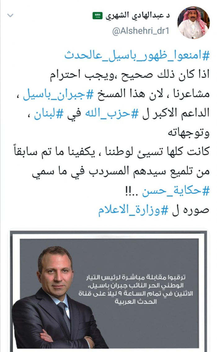 وقال الشهري في تغريدة له عبر "تويتر" رصدها "المشهد العربي"عبر هاشتاج "#امنعوا_ظهور_باسيل_عالحدث:" إذا كان ذلك صحيح ويجب احترام مشاعرنا ، لأن هذا المسخ جبران باسيل ، الداعم الأكبر لحزب الله في لبنان ، وتوجهاته كانت كلها تسيئ لوطننا".