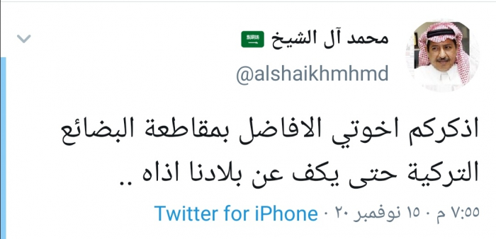 وقال آل الشيخ في تغريدة له عبر "تويتر" رصدها "المشهد العربي": "أذكركم إخوتي الأفاضل بمقاطعة البضائع التركية حتى يكف عن بلادنا أذاه".