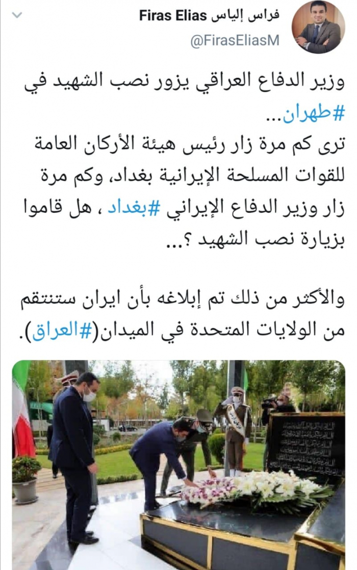 وكتب إلياس في تغريدة له عبر حسابه بتويتر ورصدها المشهد العربي" وزير الدفاع العراقي يزور نصب الشهيد في طهران".. متسائلا: "ترى كم مرة زار رئيس هيئة الأركان العامة للقوات المسلحة الإيرانية بغداد، وكم مرة زار وزير الدفاع الإيراني بغداد، هل قاموا بزيارة نصب الشهيد"؟