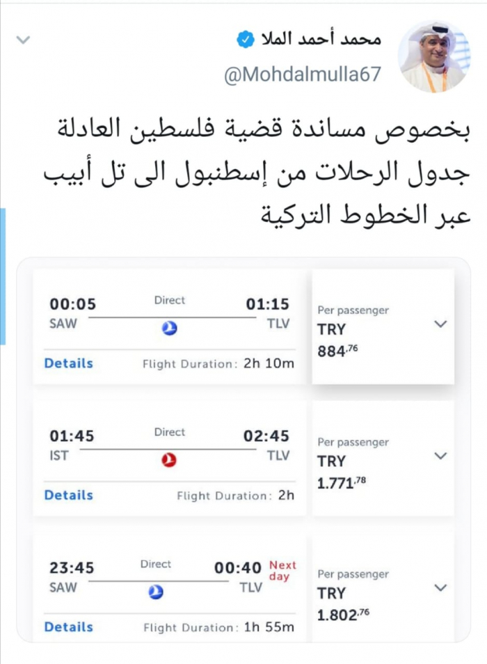 وكتب الملا في تغريدة له عبر حسابه بتويتر ورصدها "المشهد العربي": "بخصوص مساندة قضية فلسطين العادلة جدول الرحلات من إسطنبول إلى تل أبيب عبر الخطوط التركية".