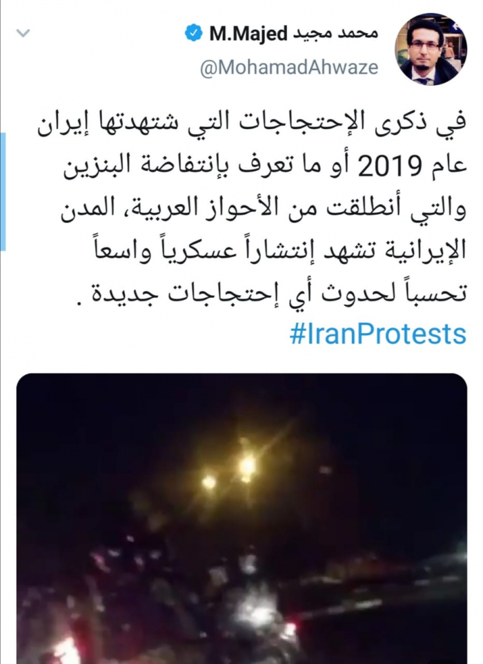 وكتب مجيد في تغريدة له عبر حسابه بتويتر ورصدها "المشهد العربي": "في ذكرى الاحتجاجات التي شتهدتها إيران عام 2019 أو ما تعرف بإنتفاضة البنزين والتي أنطلقت من الأحواز العربية، المدن الإيرانية تشهد إنتشاراً عسكرياً واسعاً تحسباً لحدوث أي احتجاجات جديدة".