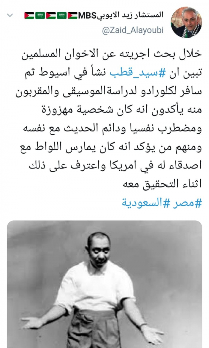 وقال الأيوبي عبر تغريدة له على "تويتر" رصدها " المشهد العربي": "خلال بحث أجريته عن الإخوان المسلمين تبين أن #سيد_قطب نشأ في أسيوط ثم سافر لكلورادو لدراسة الموسيقى".