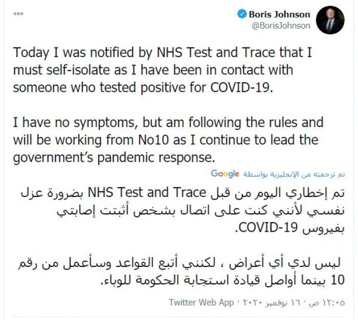وقالت جونسون في تغريدة له: "تم إخطاري اليوم من قبل NHS Test and Trace بضرورة عزل نفسي لأنني كنت على اتصال بشخص أثبتت إصابتي بفيروس "COVID-19.