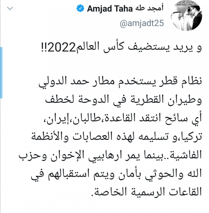 وقال طه في تغريدة له عبر حسابه بتويتر ورصدها "المشهد العربي": "و يريد يستضيف كأس العالم2022! نظام قطر يستخدم مطار حمد الدولي وطيران القطرية في الدوحة لخطف أي سائح انتقد القاعدة،طالبان،إيران، تركيا، و تسليمه لهذه العصابات والأنظمة الفاشية".