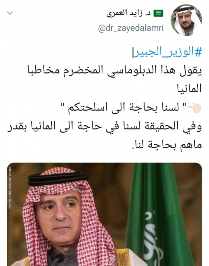 وقال العمري في تغريدة له عبر حسابه بتويتر ورصدها المشهد العربي: "الوزير الجبير يقول هذا الدبلوماسي المخضرم مخاطبا ألمانيا: " لسنا بحاجة إلى أسلحتكم".