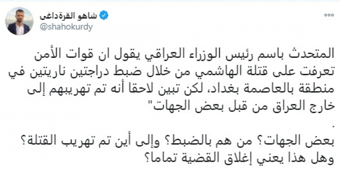 وقال في تغريدة عبر "تويتر" رصدها "المشهد العربي": "المتحدث باسم رئيس الوزراء العراقي يقول أن قوات الأمن تعرفت على قتلة الهاشمي من خلال ضبط دراجتين ناريتين في منطقة بالعاصمة بغداد، لكن تبين لاحقا أنه تم تهريبهم إلى خارج العراق من قبل بعض الجهات. بعض الجهات؟ من هم بالضبط؟ وإلى أين تم تهريب القتلة؟ وهل هذا يعني إغلاق القضية تماما؟".