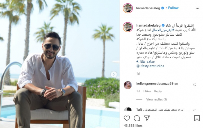 ونشر "هلال" صورًا له، عبر حسابه الرسمي بموقع "إنستجرام"، وعلق: "انتظروا قريبًا إن شاء الله كليب غنوة آية من الجمال، استنوا كليب مختلف من إخراج عادل سرحان".