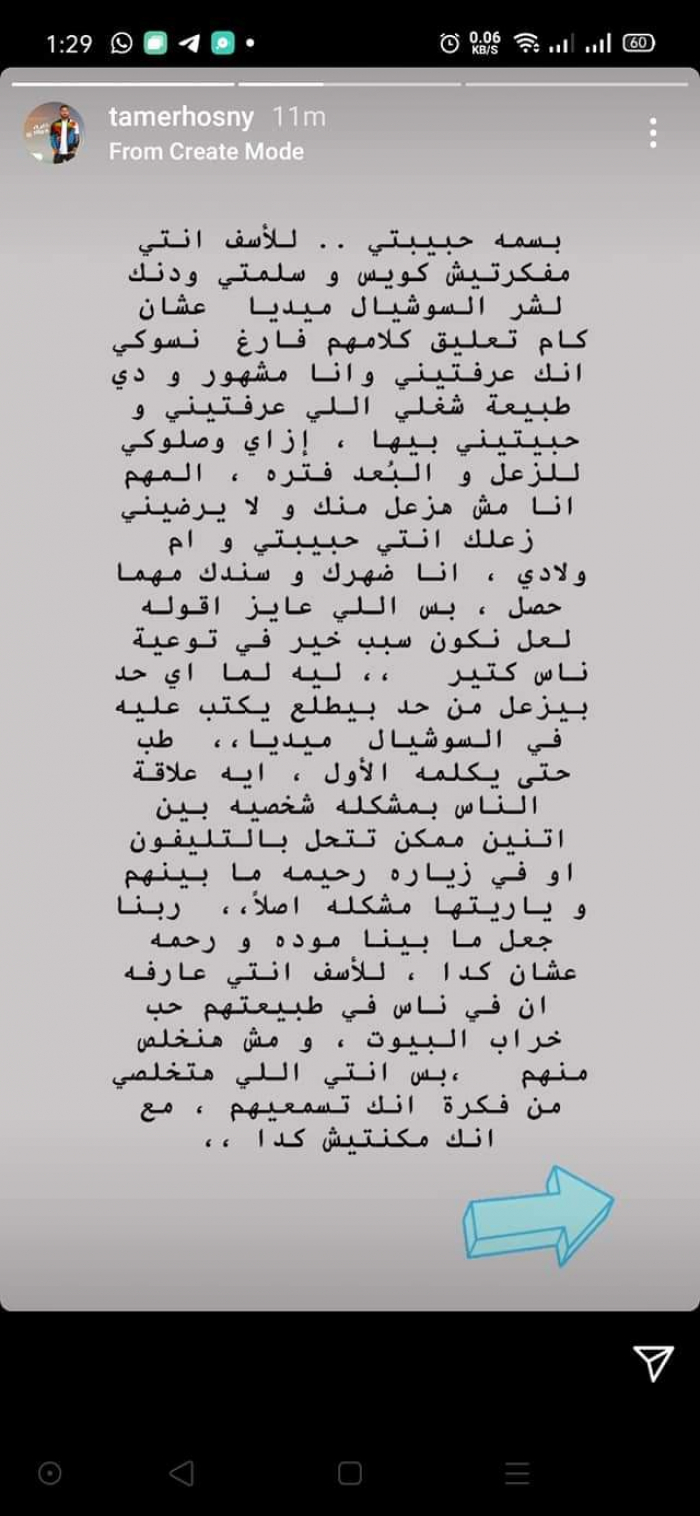 وأضاف تامر :"المهم أنا مش هزعل منك، ولا يرضيني زعلك، أنتي حبيبتي، وأم ولادي أنا سندك وظهرك مهما حصل، بس اللي عايز أقوله لعل نكون سبب خير في توعية ناس كتير، ليه لما أي حد بيزعل من حد بيطلع يكتب عليه في السوشيال ميديا، طب حتى يكلمه الأول، إيه علاقة الناس بمشكلة شخصية بين اتنين ممكن تتحل بالتليفون، أو في زيارة رحيمة بينهم، ويارتها مشكلة أصلا، وربنا جعل ما بينا مودة ورحمة، عشان كدا للأسف أنتي عارفة إن في ناس في طبيعتهم حب خراب البيوت، ومش هنخلص منهم بس أنتي اللي هتخلصي، من فكرة إنك تسمعيهم، مع إنك مكنتيش كدا".