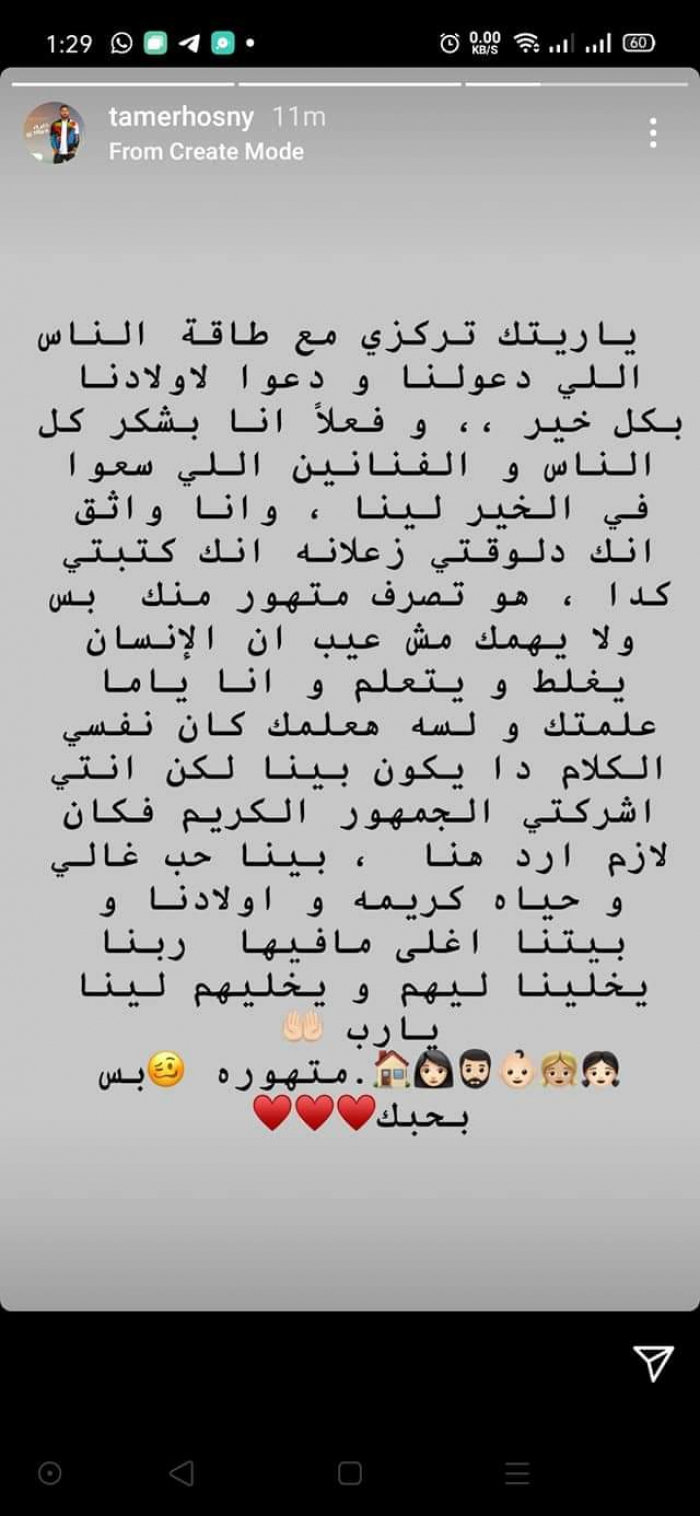 وتابع تامر في منشورًا أخر :"ياريت تركزي مع طاقة الناس اللي دعولنا ودعوا لاولادنا بكل خير، وفعلا أنا بشكر كل الناس والفنانين اللي سعوا في الخير لينا، وأنا واثق إنك زعلانة دلؤتي أنك كتبتي كدا، هو تصرف متهور منك بس ولا يهمك مش عيب الإنسان يغلط ويتعلم، وأنا ياما علمتك ولسه هعلمك، كان نفسي الكلام دا يكون بينا لكن أنتي أشركتي الجمهور الكريم فكان لازم أرد هنا، بينا حب غالي وحياة كريمة وأولادنا وبينا أغلى ما فيها ربنا يخلينا لينا ويخليهم لينا، يارب، متهورة بس بحبك".