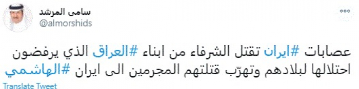 وكتب في تغريدة عبر "تويتر" رصدها "المشهد العربي": "عصابات إيران تقتل الشرفاء من أبناء العراق الذي يرفضون احتلالها لبلادهم وتهرّب قتلتهم المجرمين إلى إيران الهاشمي".