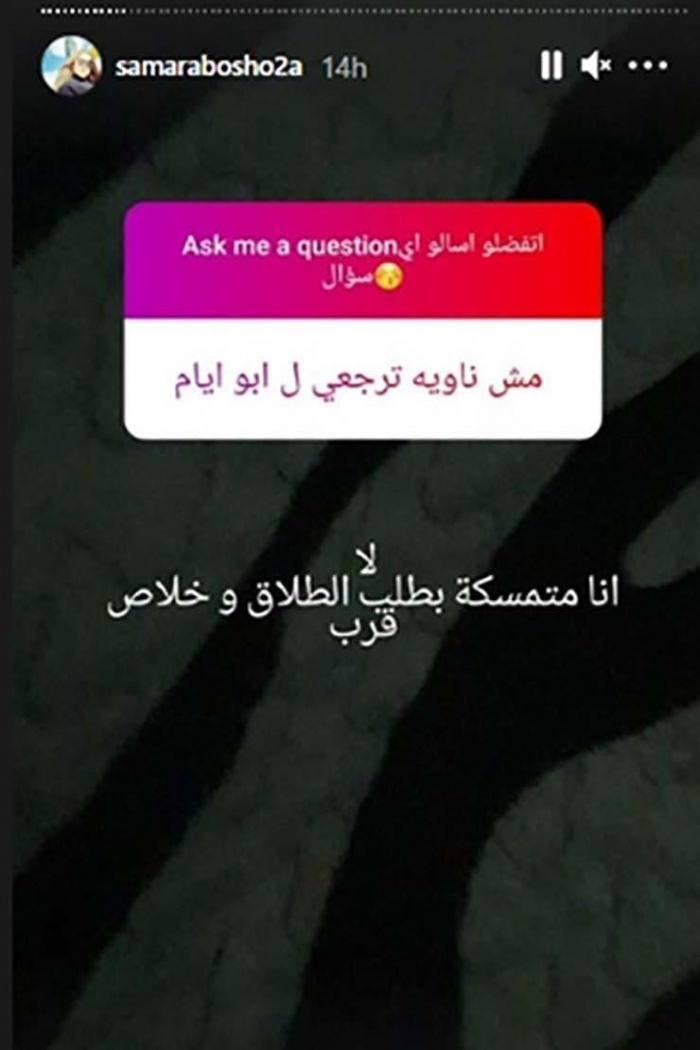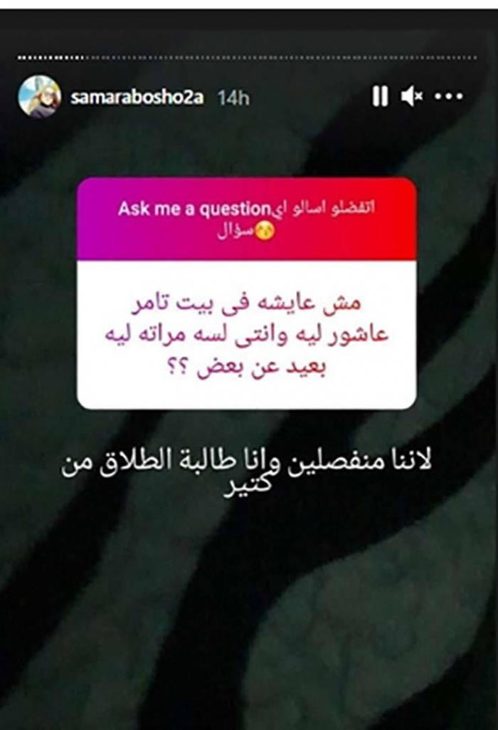 تحدثت سمر أبو شقة زوجة المطرب تامر عاشور عن حقيقة طلبها للطلاق من زوجها من خلال عدة أسئلة طرحها عليها متابعيها، عبر حسابها بموقع "إنستجرام".