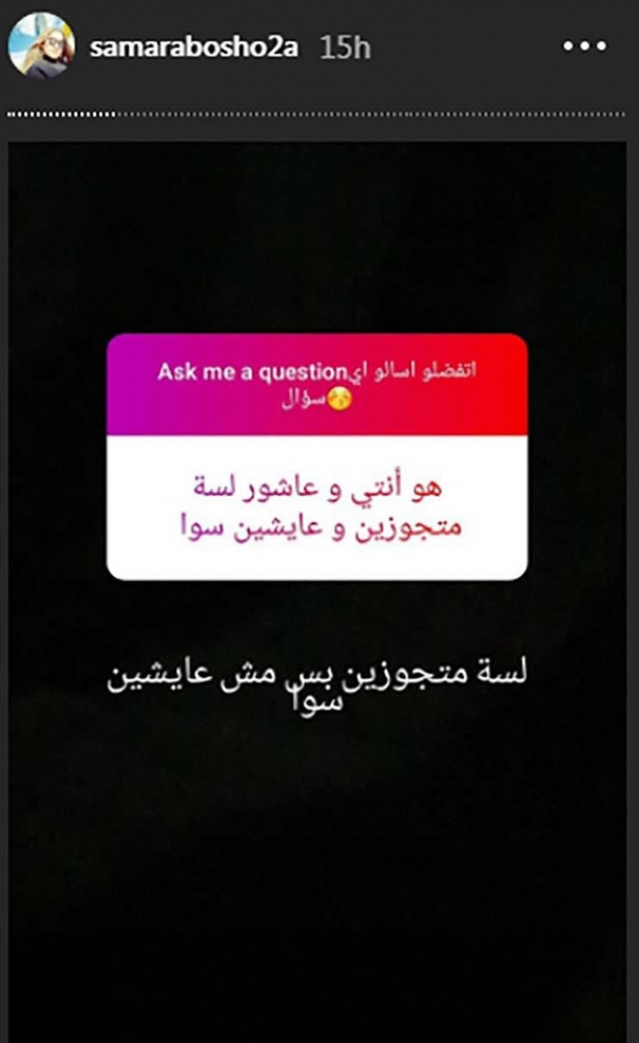وطرح أحد المتابعين سؤال أخر، هو أنتي وعاشور لسه متجوزين وعايشين سوا؟، ردت سمر : "لسه متجوزين بس مش عايشين سوا".