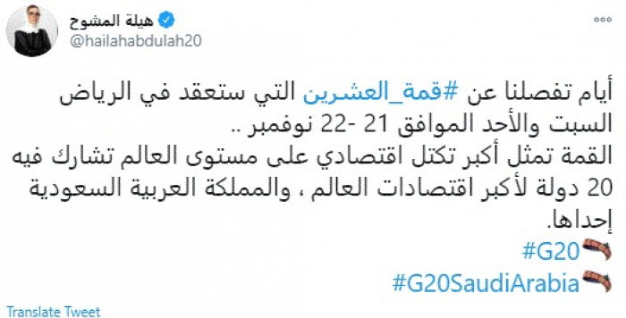 وقالت في تغريدة عبر "تويتر" رصدها "المشهد العربي": "أيام تفصلنا عن قمة العشرين التي ستعقد في الرياض السبت والأحد الموافق 21 -22 نوفمبر .. القمة تمثل أكبر تكتل اقتصادي على مستوى العالم تشارك فيه 20 دولة لأكبر اقتصادات العالم، والمملكة العربية السعودية إحداها".