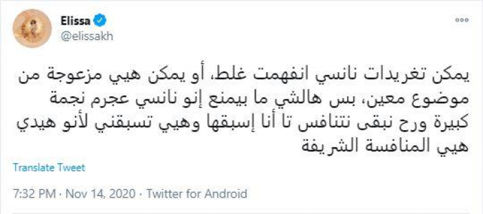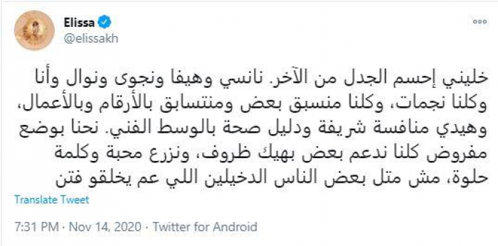 لم تسكت إليسا وردت عبر حسابها على "تويتر": "خليني أحسم الجدل من الآخر.. نانسي وهيفاء ونجوى ونوال وأنا وكلنا نجمات، وكلنا منسبق بعض ومنتسابق بالأرقام وبالأعمال، وهيدي منافسة شريفة ودليل صحة بالوسط الفني، نحنا بوضع مفروض كلنا ندعم بعض بهيك ظروف، ونزرع محبة وكلمة حلوة، مش متل بعض الناس الدخيلين اللي عم يخلقوا فتن".