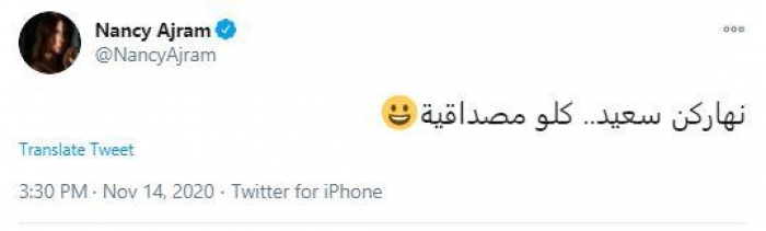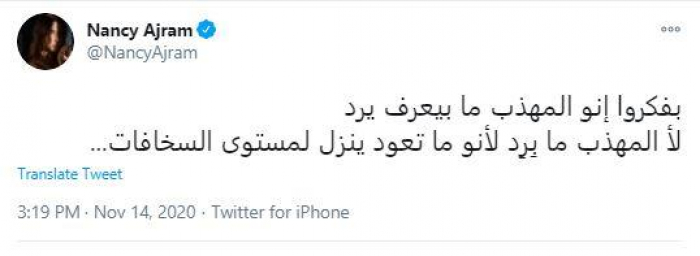 خرجت نانسي عجرم، عن صمتها مساء الجمعة في عدة تغريدات أثارت الجدل عبر "تويتر"، وقالت: "بفكروا إنو المهذب ما بيعرف يرد.. لأ المهذب ما بيرِد لأنو ما تعود ينزل لمستوى السخافات".