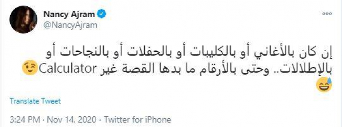 وأضافت: "إن كان بالأغاني أو بالكليبات أو بالحفلات أو بالنجاحات أو الإطلالات وحتى بالأرقام، ما بدها القصة غير آلة حاسبة".