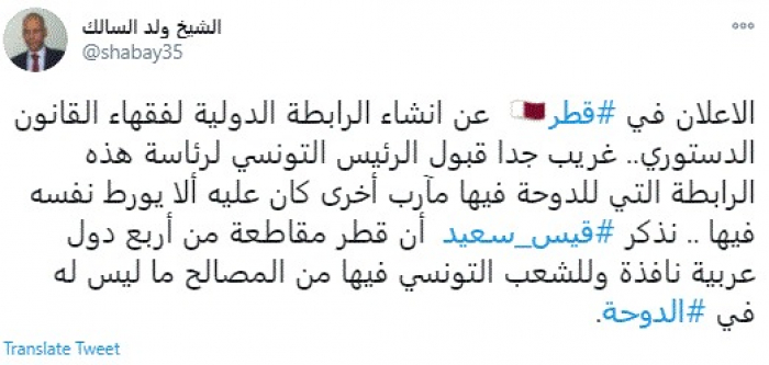 وقال في تغريدة عبر "تويتر" رصدها "المشهد العربي": "الإعلان في قطر عن إنشاء الرابطة الدولية لفقهاء القانون الدستوري.. غريب جدا قبول الرئيس التونسي لرئاسة هذه الرابطة التي للدوحة فيها مآرب أخرى كان عليه ألا يورط نفسه فيها".