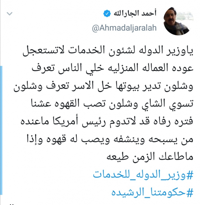 وقال الجار الله عبر تغريدة له على " تويتر" رصدها " المشهد العربي :" ياوزير الدولة لشؤون الخدمات لا تستعجل عودة العمالة المنزلية خلي الناس تعرف وشلون تدير بيوتها خل الأسر تعرف وشلون تسوي الشاي وشلون تصب القهوة عشنا فترة رفاه قد لاتدوم".