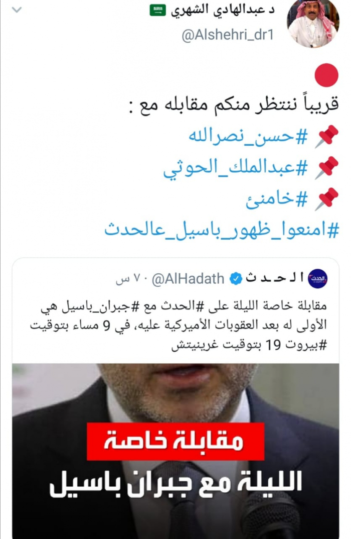 وقال الشهري في تغريدة له عبر "تويتر" رصدها "المشهد العربي"قريباً ننتظر منكم مقابله مع : "حسن نصرالله، عبدالملك الحوثي، خامنئ"، مختتما بهاشتاج #امنعوا_ظهور_باسيل_عالحدث".