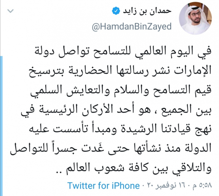 وأشار الشيخ حمدان في تغريدة له عبر حسابه بتويتر ورصدها المشهد العربي إلى أن ذلك "هو أحد الأركان الرئيسية في نهج قيادتنا الرشيدة ومبدأ تأسست عليه الدولة منذ نشأتها حتى غَدت جسراً للتواصل والتلاقي بين كافة شعوب العالم".