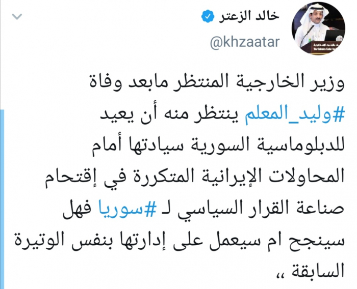 وقال الزعتر عبر تغريدة له على "تويتر" رصدها "المشهد العربي" :"وزير الخارجية المنتظر مابعد وفاة وليد المعلم ينتظر منه أن يعيد للدبلوماسية السورية سيادتها أمام المحاولات الإيرانية المتكررة في إقتحام صناعة القرار السياسي لسوريا فهل سينجح أم سيعمل على إدارتها بنفس الوتيرة السابقة".