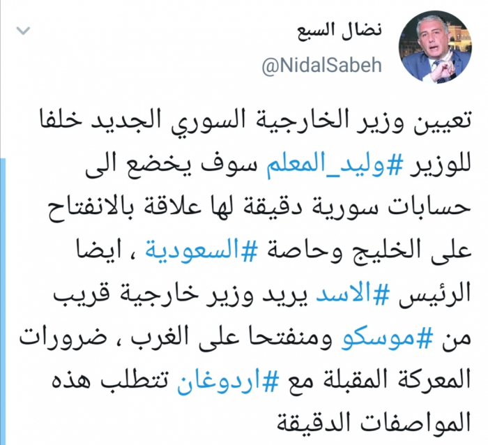 قال المحلل السياسي اللبناني نضال السبع، إن تعيين وزير الخارجية السوري الجديد خلفا للوزير وليد المعلم سوف يخضع إلى حسابات سورية دقيقة لها علاقة بالانفتاح على الخليج وحاصة السعودية.