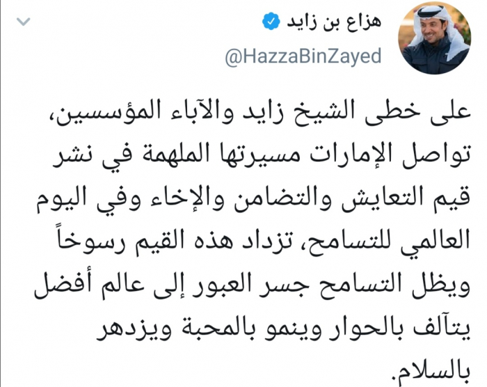 هزاع بن زايد يغرد في اليوم العالمي للتسامح بهذه الكلمات