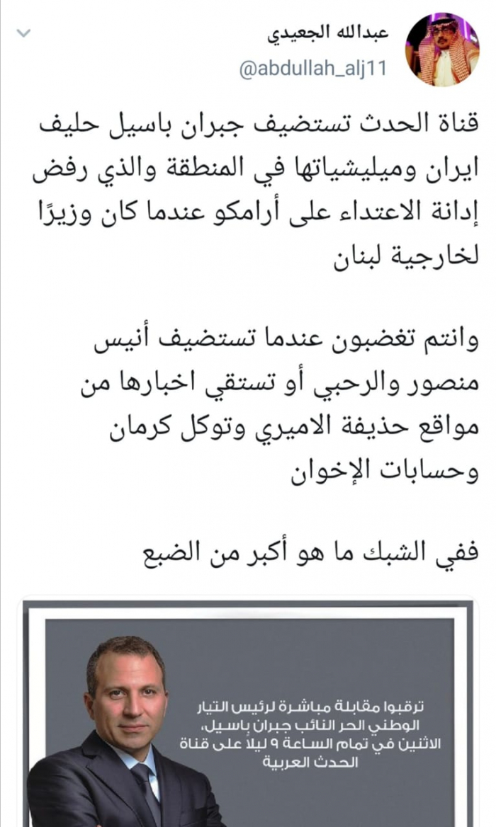 وقال الجعيدي عبر حسابه في تويتر ورصدها "المشهد العربي": "قناة الحدث تستضيف جبران باسيل حليف إيران ومليشياتها في المنطقة والذي رفض إدانة الاعتداء على أرامكو عندما كان وزيرًا لخارجية لبنان".