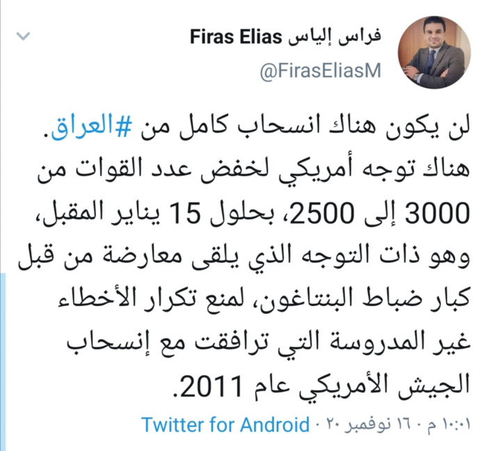 وقال إلياس في تغريدة له عبر حسابه بتويتر ورصدها المشهد العربي" لن يكون هناك انسحاب كامل من العراق هناك توجه أمريكي لخفض عدد القوات من 3000 إلى 2500، بحلول 15 يناير المقبل".
