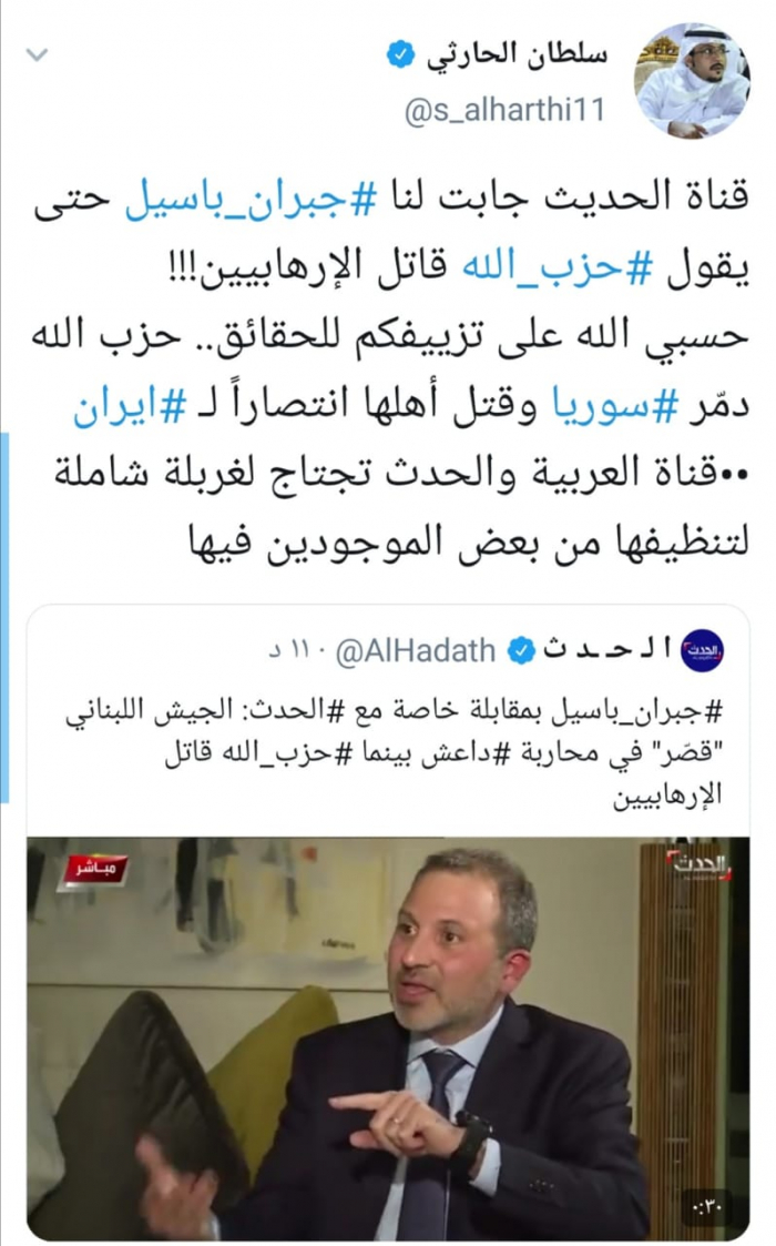 وقال الحارثي في تغريدة له عبر "تويتر" رصدها "المشهد العربي": "قناة الحديث جابت لنا جبران باسيل حتى يقول حزب الله قاتل الإرهابيين".