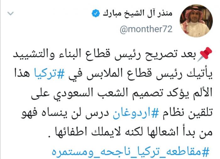 وقال آل شيخ المبارك عبر تغريدة له على "تويتر" رصدها " المشهد العربي" : "بعد تصريح رئيس قطاع البناء والتشييد يأتيك رئيس قطاع الملابس في تركيا هذا الألم يؤكد تصميم الشعب السعودي على تلقين نظام أردوغان درس لن ينساه فهو من بدأ إشعالها لكنه لايملك إطفائها".