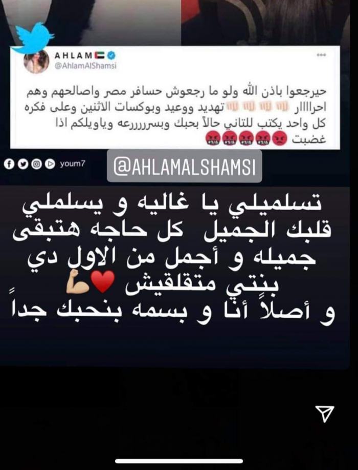 وجه الفنان تامر حسني، رسالة إلى النجمة الإماراتية أحلام الشامسي، بعد تدخلها للصلح بينه وزوجته الفنانة بسمة بوسيل، بعد إعلانها انفصالهما قبل 3 أيام.