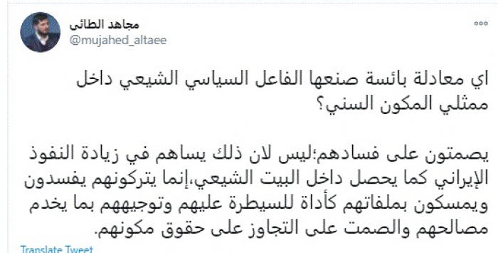 وقال في تغريدة عبر "تويتر" رصدها "المشهد العربي": "أي معادلة بائسة صنعها الفاعل السياسي الشيعي داخل ممثلي المكون السني؟".