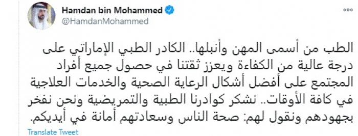 وقال في تغريدة عبر "تويتر" رصدها "المشهد العربي": "الطب من أسمى المهن وأنبلها.. الكادر الطبي الإماراتي على درجة عالية من الكفاءة ويعزز ثقتنا في حصول جميع أفراد المجتمع على أفضل أشكال الرعاية الصحية والخدمات العلاجية في كافة الأوقات.. نشكر كوادرنا الطبية والتمريضية ونحن نفخر بجهودهم ونقول لهم: صحة الناس وسعادتهم أمانة في أيديكم".