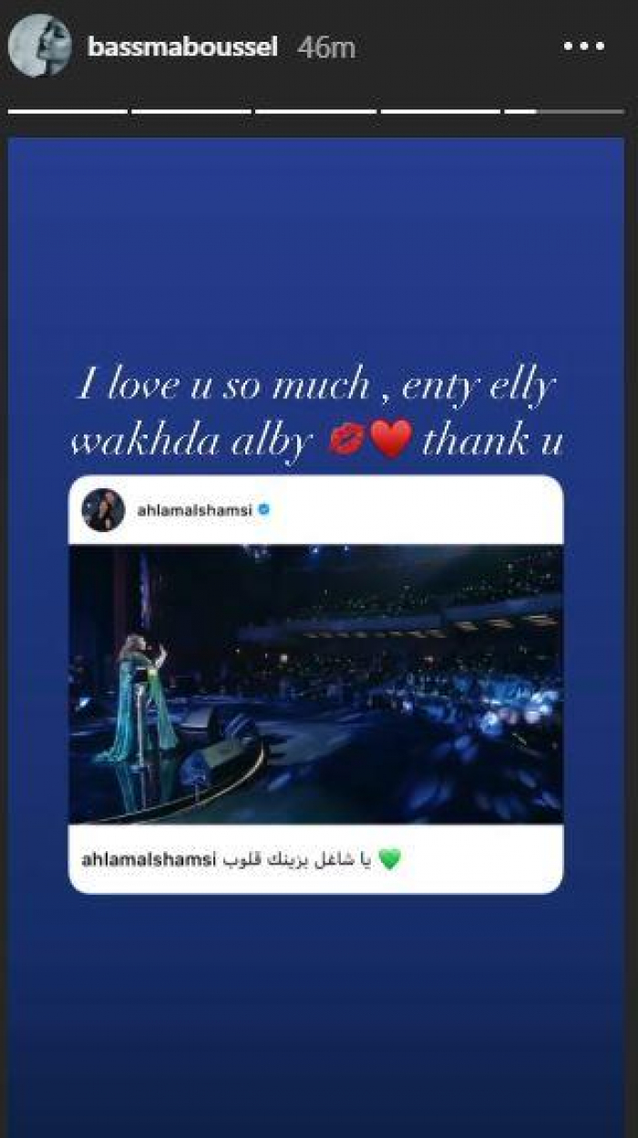 وكتبت بسمة، عبر "ستوري إنستجرام" مخاطبة أحلام: "أنا بحبك جدًا.. إنتي اللي واخدة قلبي.. شكرًا ليكي".