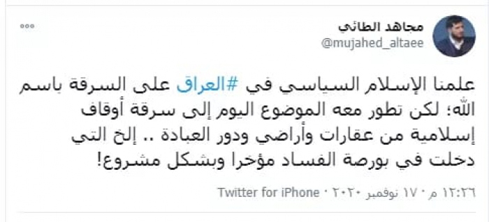 وقال في تغريدة عبر "تويتر" رصدها "المشهد العربي": "علمنا الإسلام السياسي في العراق على السرقة باسم الله؛ لكن تطور معه الموضوع اليوم إلى سرقة أوقاف إسلامية من عقارات وأراضي ودور العبادة .. إلخ التي دخلت في بورصة الفساد مؤخرا وبشكل مشروع".