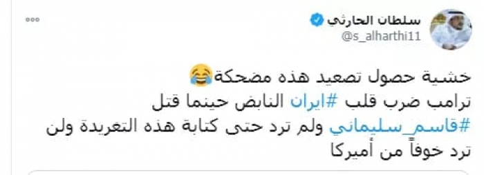 وقال في تغريدة عبر "تويتر" رصدها "المشهد العربي": "خشية حصول تصعيد هذه مضحكة ترامب ضرب قلب إيران النابض حينما قتل قاسم سليماني ولم ترد حتى كتابة هذه التغريدة ولن ترد خوفاً من أميركا".