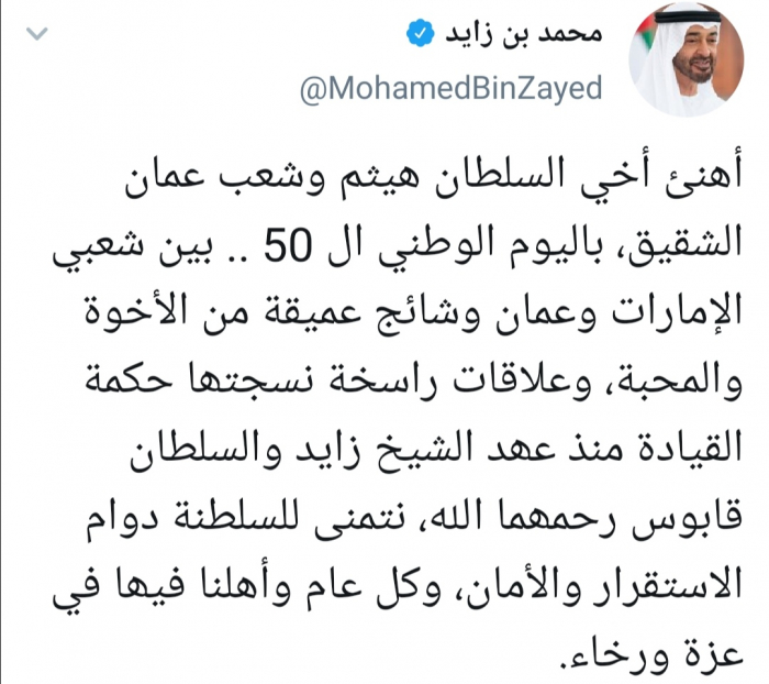 وقال بن زايد في تغريدة عبر "تويتر" رصدها "المشهد العربي": "أهنئ أخي السلطان ھیثم وشعب عمان الشقیق، بالیوم الوطني الـ 50 .. بین شعبي الإمارات وعمان وشائج عمیقة من الأخوة والمحبة، وعلاقات راسخة نسجتھا حكمة القیادة منذ عھد الشیخ زاید والسلطان قابوس رحمھما الله".