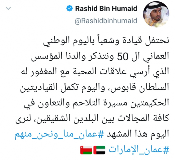 وقال النعيمي عبر حسابه بتويتر ورصدها المشهد العربي "نحتفل قيادة وشعباً باليوم الوطني العماني ال 50 ونتذكر والدنا المؤسس الذي أرسي علاقات المحبة مع المغفور له السلطان قابوس".
