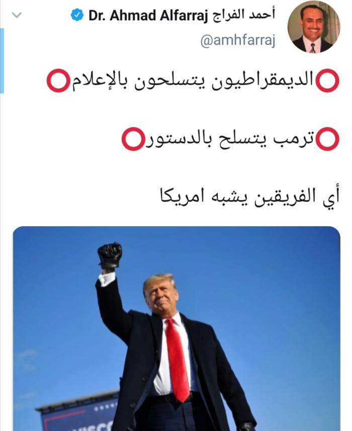أكد الكاتب والباحث السعودي أحمد الفراج، أن الرئيس الأمريكي المنتهية ولايته دونالد ترامب يتسلح بالدستور، بينما الديمقراطيين يتسلحون بالإعلام.